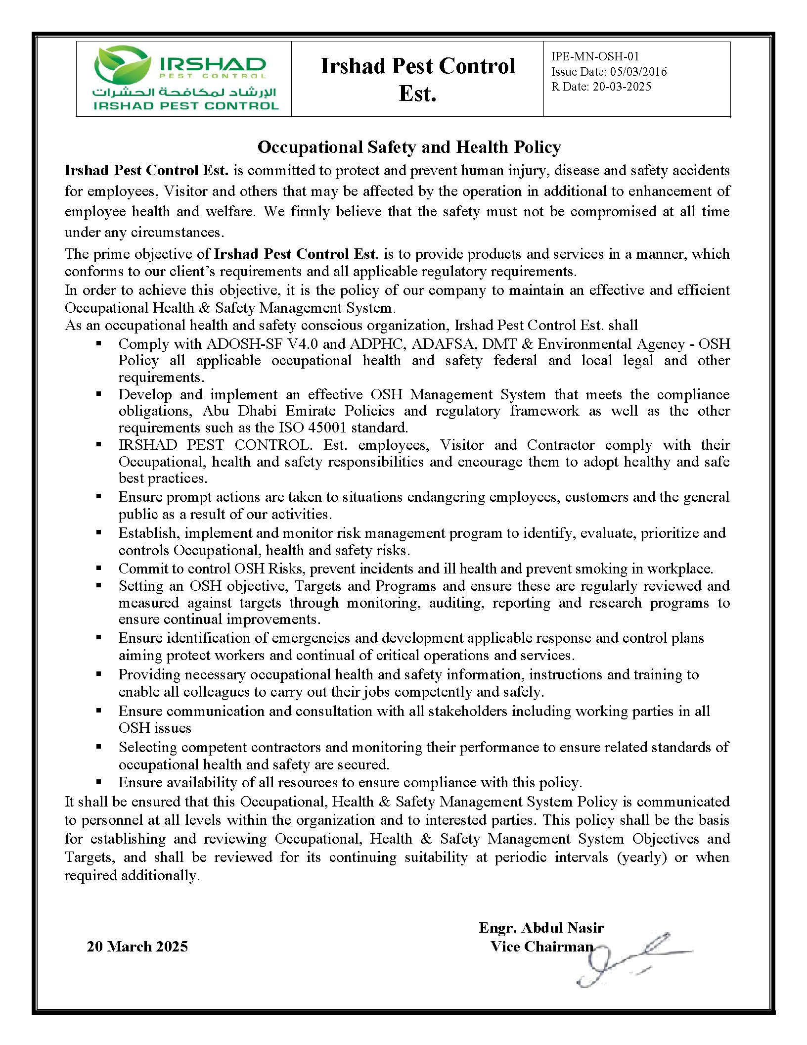The prime objective of Irshad Pest Control Est. is to provide products and services in a manner, which conforms to our client’s requirements and all applicable regulatory requirements. In order to achieve this objective, it is the policy of our company to maintain an effective and efficient Occupational Health & Safety Management System.